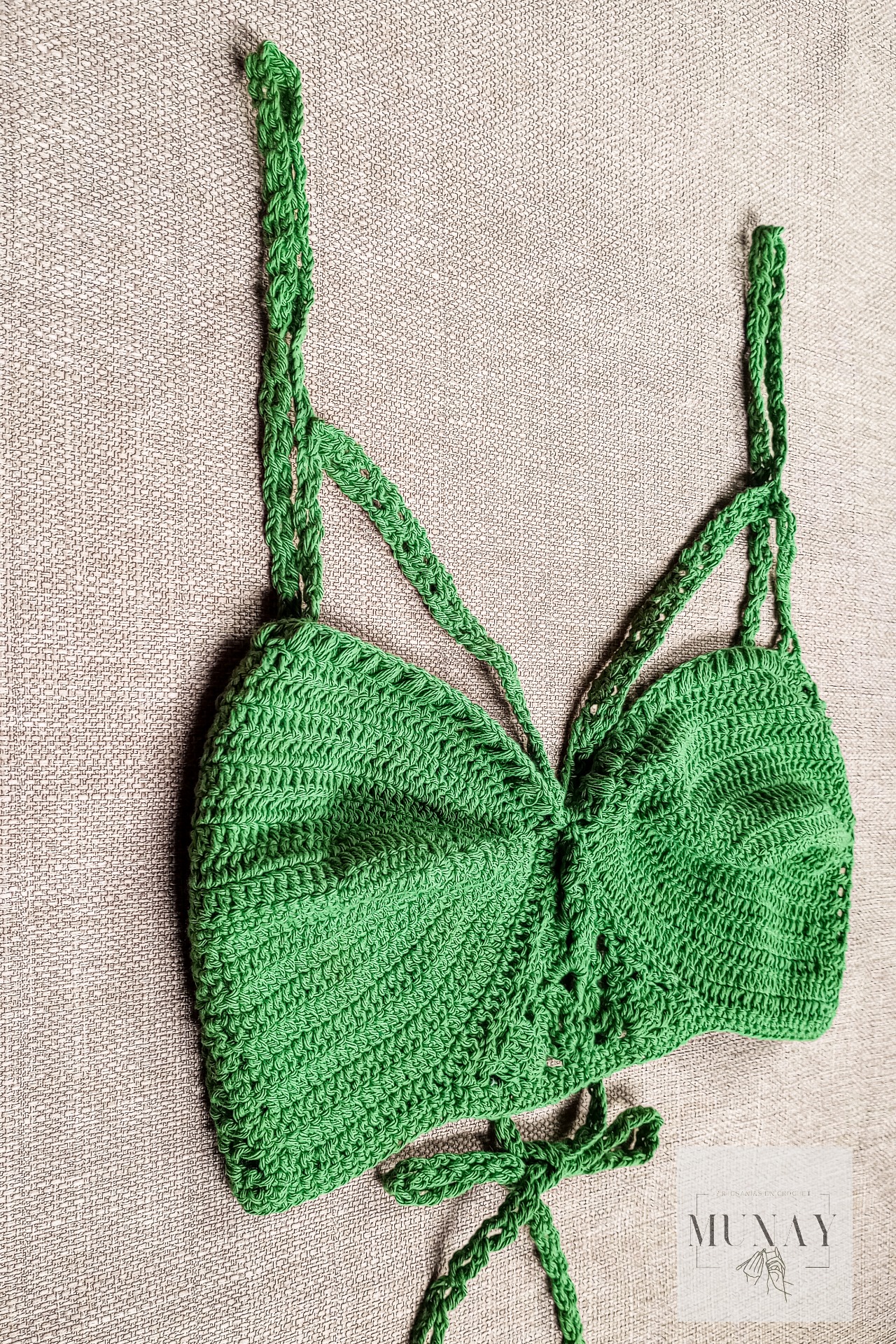 Top realizado en hilo de algodón, con detalles de tiras en frente y espalda.Al tener tiras regulables, el talle se adapta del 1 al 3.